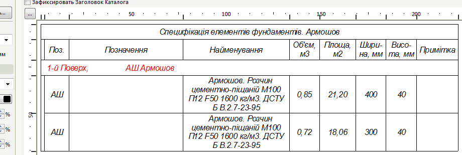 Нижче наведено приклад таких специфікацій за елементами фундаментів.